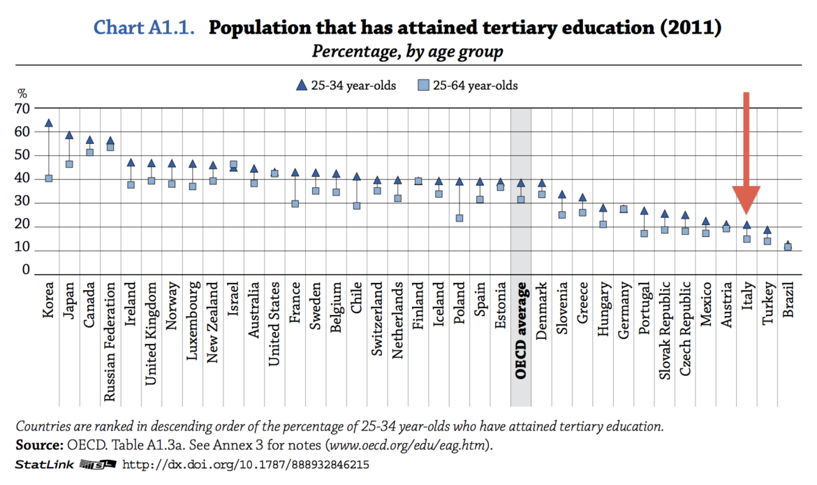 Le cose, in realtà, sono un po’ diverse. In Italia meno di un lavoratore su cinque è laureato. In Gran Bretagna sono più del doppio. Non è tutto: solo il 30% dei 19enni italiani si immatricolano all’Università. E 17 su 100 di quelli che si iscrivono, abbandonano nel corso del primo anno. Spesso i problemi sono a monte: se tornassero ai tempi dell’iscrizione alla scuola superiore, 44 diplomati su cento cambierebbero l’indirizzo di studi. La scelta sbagliata è dovuta, nella maggior parte dei casi, all’ambizione dei genitori che non ammettono per i propri figli scelte diverse rispetto al liceo. Oggi, infatti, 82 immatricolati su cento provengono da famiglie i cui genitori non hanno esperienza di studi universitari.